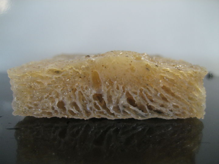 下の写真は、コンニャクをゆっくりと冷却した「緩慢冷凍」と短い時間で冷却した「急速冷凍」を比べたものです。