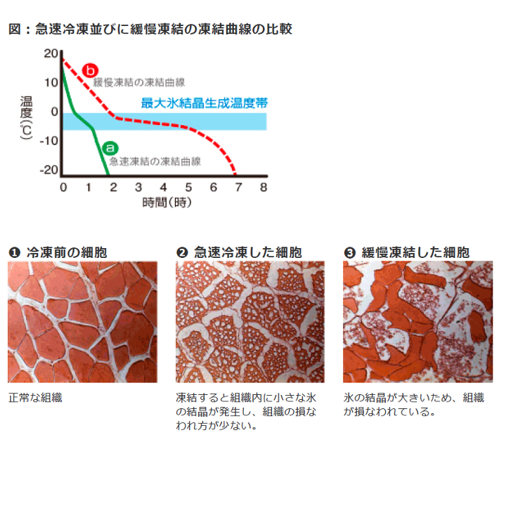 ゆっくり冷却すると食品の細胞中に大きな氷の結晶ができます。